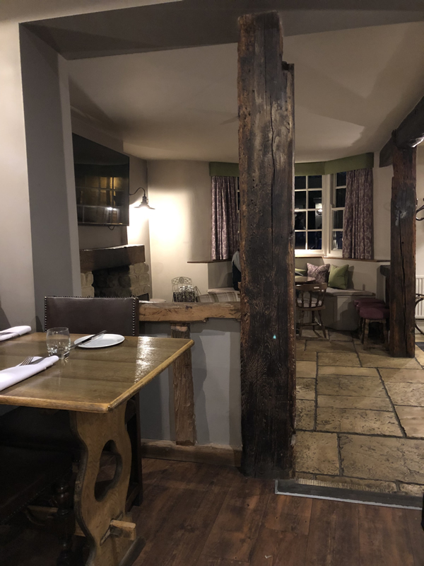 It’s certainly a step back in time with low ceilings, wooden beams, comfortable country chairs, window seats, muted colours and low lighting. You can eat anywhere in the bar or restaurant with around 23 tables in total. At the far end you’ll find a modern feel conservatory area which is great for groups of 10 or more as it gives a partial private area. This merges well with the old feel of the bar.