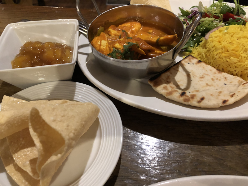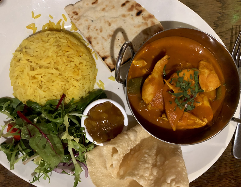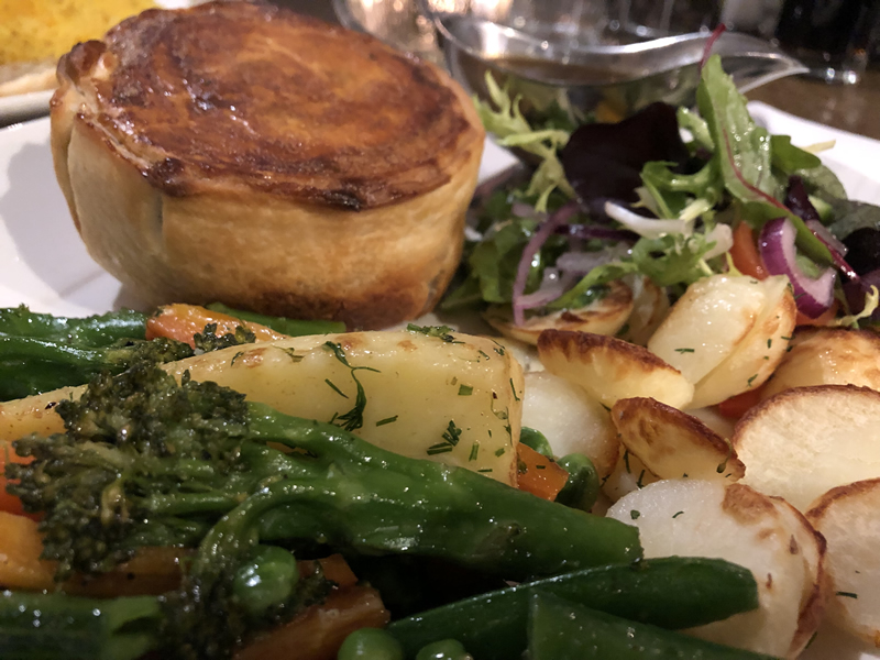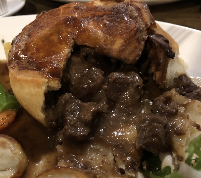 We’d already ordered the Chef’s Homemade Curry (£15.50). Ruth had suggested King Prawns but my husband really likes chicken so continued his theme. Also, as he didn’t like spicy he asked about the heat and whether it was very strong. Ruth kindly brought out a taster of the sauce from the curry just to ensure it was to his liking as everyone has a different palate and heat tolerance, she advised that to her it was normal and mild, but she normally likes a hotter one. My husband is at the lower end of the heat scale.. he tasted it and could taste the kick which wasn’t over powerful so went with it. I ordered the Hand Crimped Steak & Guinness Pie (£16.50) being told this was one of the favourites on the menu and has limited availability.