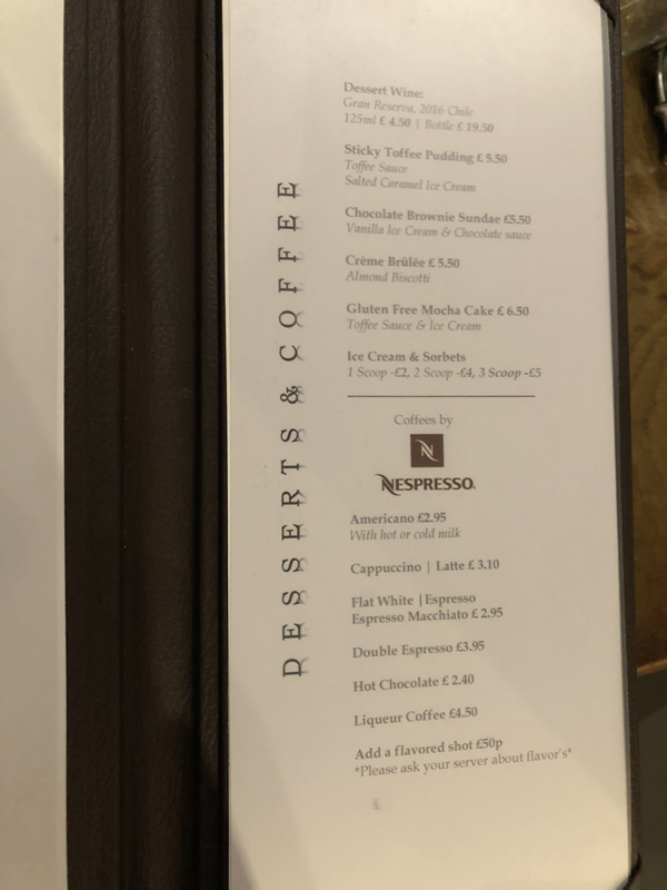 Voila here was my dessert. I’m normally a chocolate fiend, but I wanted to venture outside my ‘usual’ box and try something a bit daring and asked for the Gluten Free Mocha Cake (£6.50). I’m so daring, aren’t I! It intrigued me as it was noted at being gluten-free and I wanted to see how it would be with my sweet tooth and I wasn’t disappointed. It comes warm and served with a rich toffee sauce and vanilla ice cream on the side. How can I describe it? “Warming, filling, not too sweet – a lovely hot & cold treat to end your meal.”