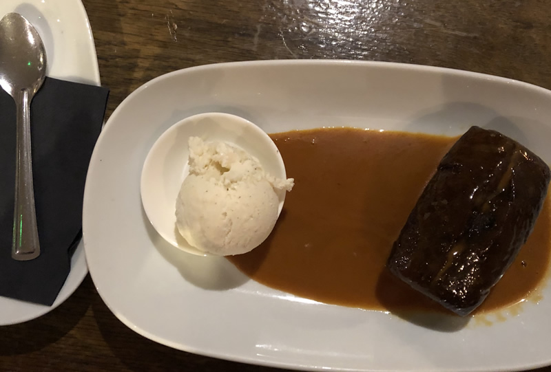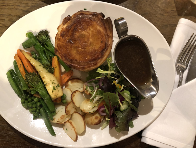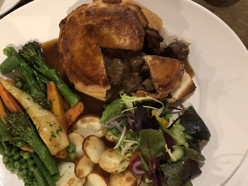 The mains arrived promptly and looked a delicious full plate of food as you can see. No half portions at all. The curry was served up in a metal bowl alongside steamed rice, a naan bread, a poppadum and chutney. Verdict: “Not over spicy, a creamy texture and with tender chicken – I’d definitely have it again!” My choice was the Pie and what a full plate that was.. the pie was a large full pastry pie, not just a lid. It was deeply filled with large chunks of steak in plenty of sauce along with herbed roasted new potatoes, sauteed veg (broccoli, mangetout, carrots and parsnip) and a gravy boat of gravy on the side. Everything was perfect what can I say? “The pie had succulent chunks of steak and the sauce was lovely – I couldn’t tell it was Guinness, but then I’ve never drunk any, it was simply a tasty, thick sauce that really did the meat justice. You won’t go hungry after this.”