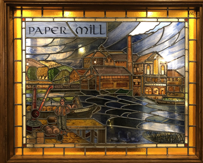 On entry you’re faced with a wonderful stained glass window which shares the history of the building; from the local stories it used to be the Paper Mill’s office.
