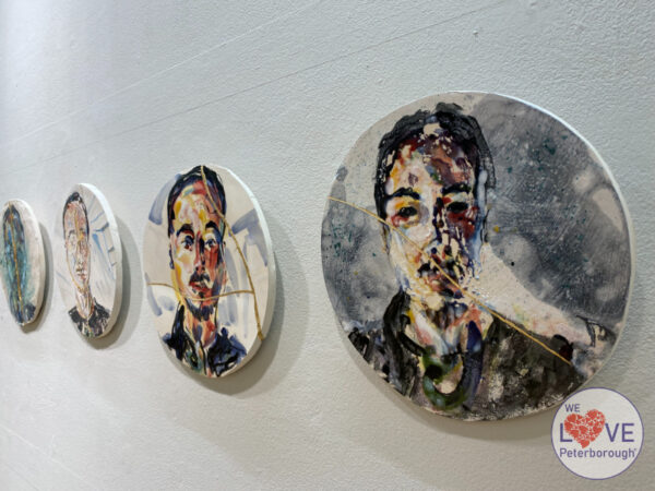 There was an interesting set of four colourful cracked discs on the wall, maybe a portrait of the artist in a mirror, maybe not? by James Chen-Wishart, visual artist: Reflecting in Circles (glaze, copper, epoxy clay and gold leaf on ceramic)