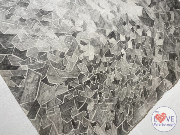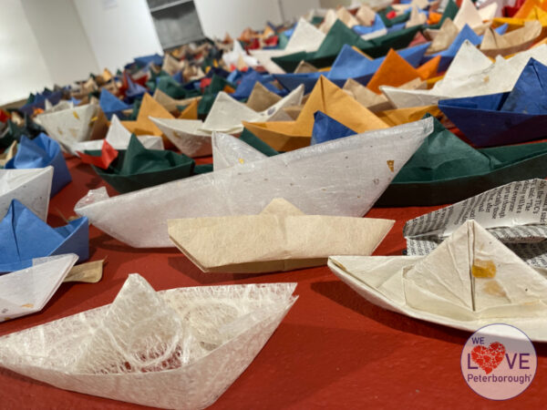 Stepping into the atrium I was confronted with a table full of paper boats, surrounded on the walls by some ‘boat’ geographic drawings: Tumble – these boats refer to the Pandemic – they are all separate but different. They speak of how we are all individuals with our own stories, but also, all part of the planet’s story. (NB I’m not quite sure if they were part of the I Matter or not…. )