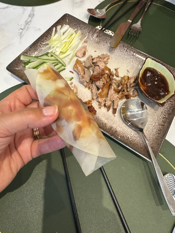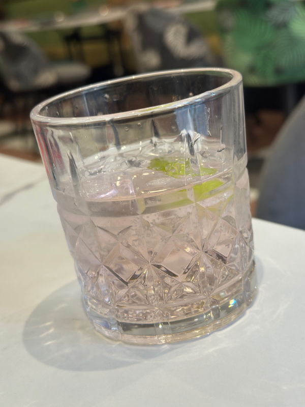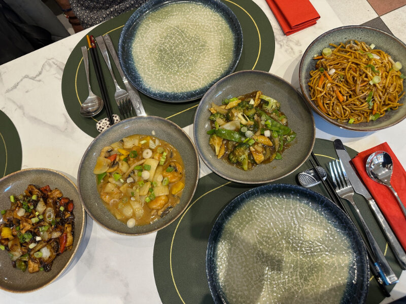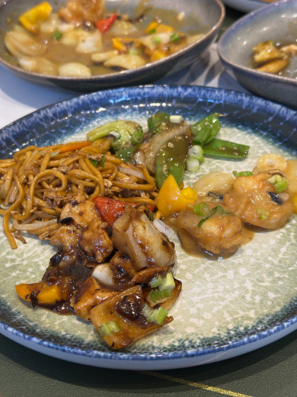 Up next was my favourite; duck pancakes and hoi sin sauce, an ample amount as a second course. Then followed…prawn in satay sauce (very moreish), stir fry mixed vegetables, chicken with black bean symphony (gorgeous) and we swapped rice for noodles. A set of four small plates, but definitely enough after a first and second course. I had a pink gin & lemonade too.