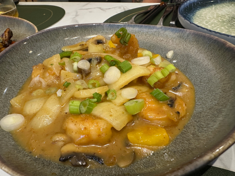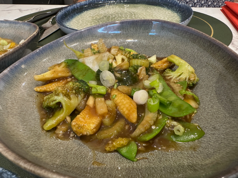 “Gloriously stuffed” describes our experience. A large plate of starters included sesame prawn toast, satay chicken skewers, deliciously sticky Peking ribs, smoked shredded chicken (wonderful taste), prawn crackers and not forgetting crunchy seaweed. You could eat this on its own for light meal as it’s lovely and filling. None of it was greasy, just good tasting food.