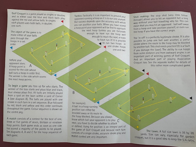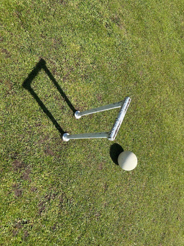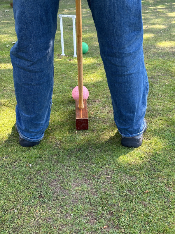 Firstly, you have to get way of holding your mallet (stick), hand at waist level and then the other hand whatever makes you feel comfortable as you’ve got to hit it from between your legs forwards. You hit your ball towards a hoop from a certain side, the other players follow. You score a point if you get your ball through the hoop, no matter how many moves you take to get there. However, players can hit you out of the way with their ball, jump over you going through the hoop, hit you from the other side of the hoop backwards… a bit like pool or bowls. In fact, if you’re good at pool and snooker, you’ll probably be good at this. Once a player is through the hoop, you then move on to the next one. There are 6 hoops to get through in total.