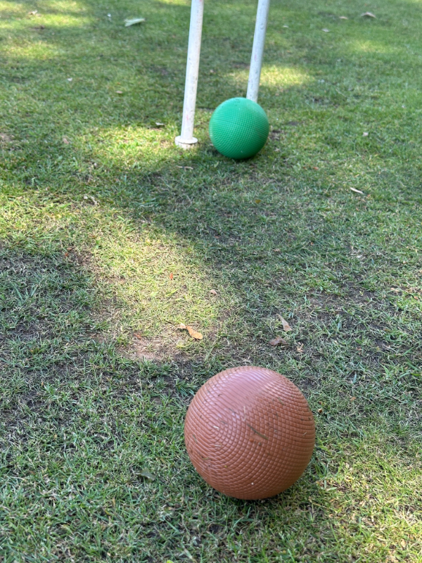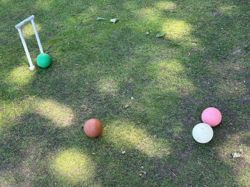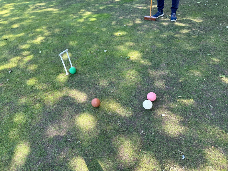 So here are a few rules of the game: You start from the corner on the croquet lawn and you go in colour order of your ball; usually, blue, red, black & yellow. As the main colour balls had gone, we had another set of colours, again with the order you have to play depending on your colour. I was brown so followed green and pink and then white followed me!