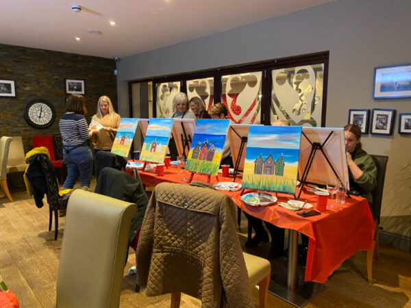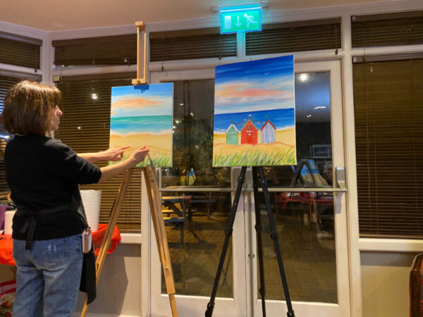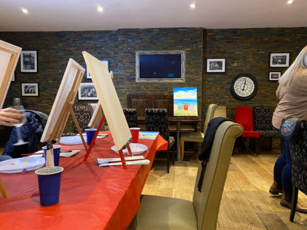 I turned up at the Windmill at Orton Waterville, got a drink from the bar and took my seat at a table with a top easel complete with large canvas, acrylic paints, paint brushes and water. In total there were 12 of us ladies with different levels of painting experience. Some had been before and others, like me, were brand-new to this type of event.