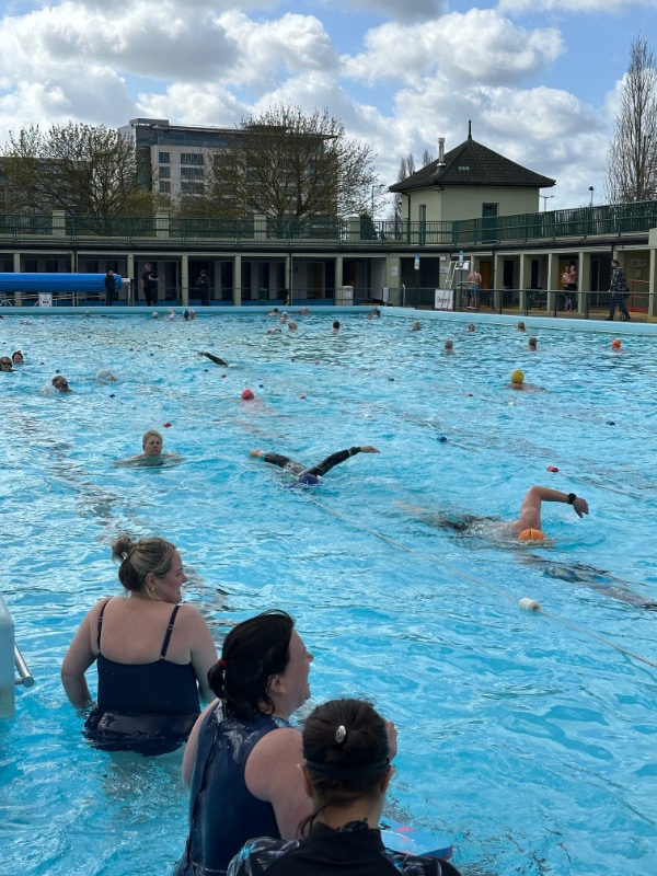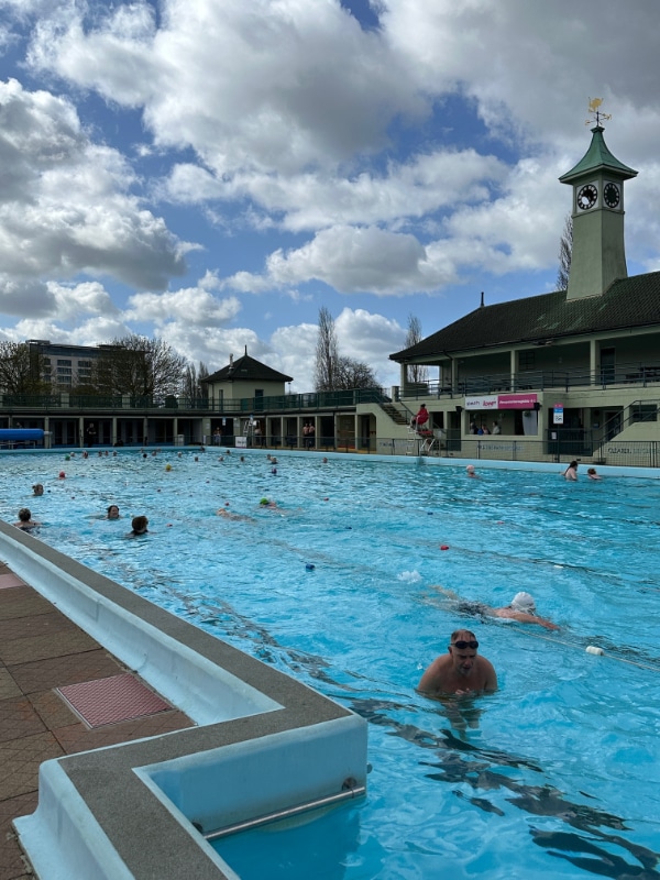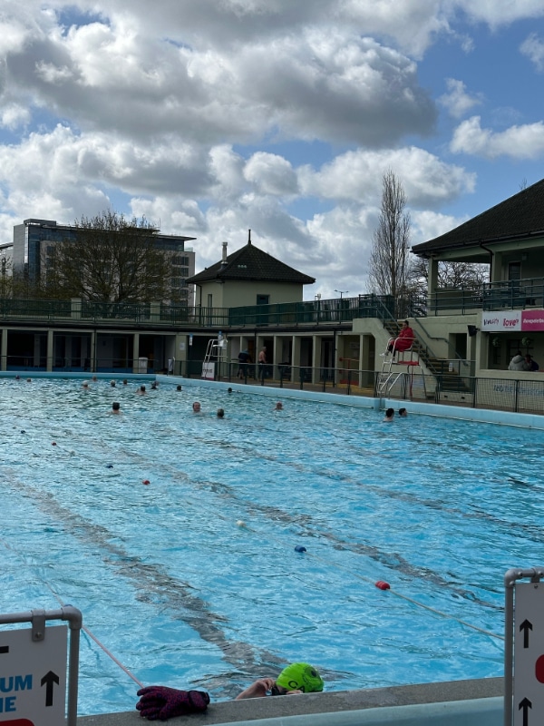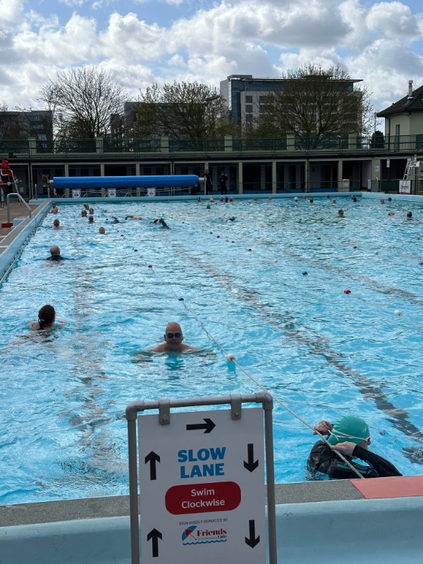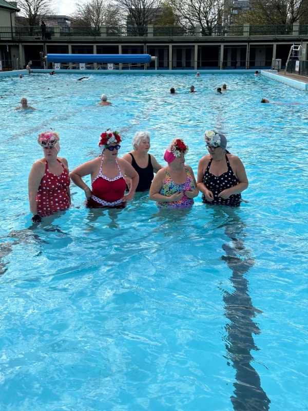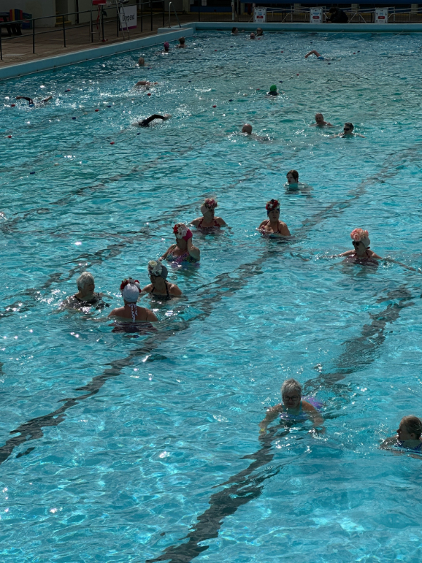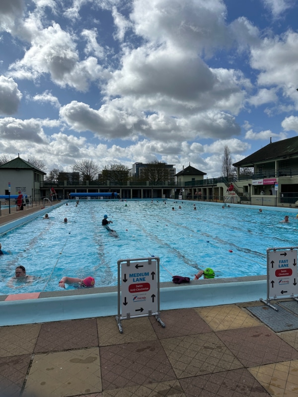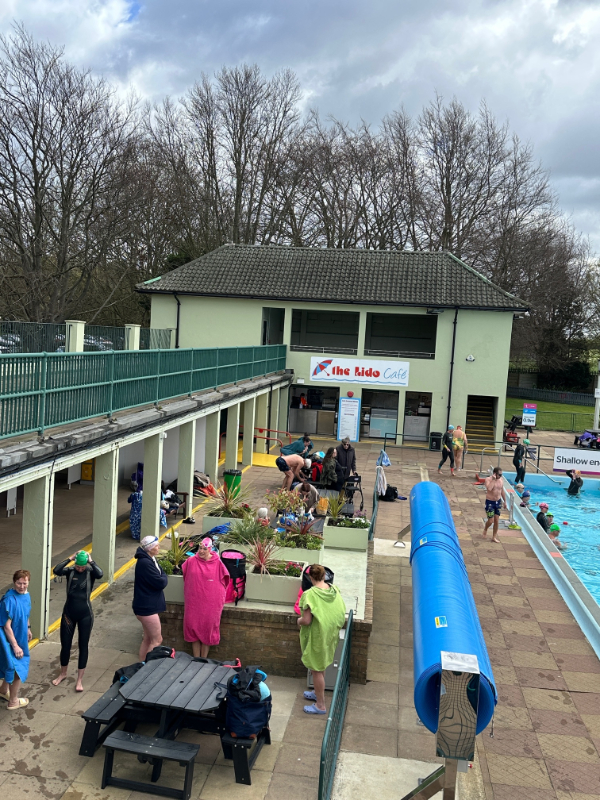 Peterborough Lido opened today (Saturday 28th March 2026) for a very long summer season and the weather is being extremely good to us with some glorious sunshine. The swimming offer of the year is today and tomorrow’s swim is only going to cost you 90p. The Lido Belles were some of the first swimmers in the pool with their fabulous swim hats. And Friends of Peterborough Lido group had their pre-season swim (the actual first people in) on Friday 27th March – lucky them.